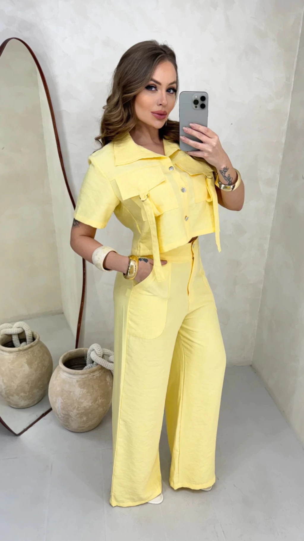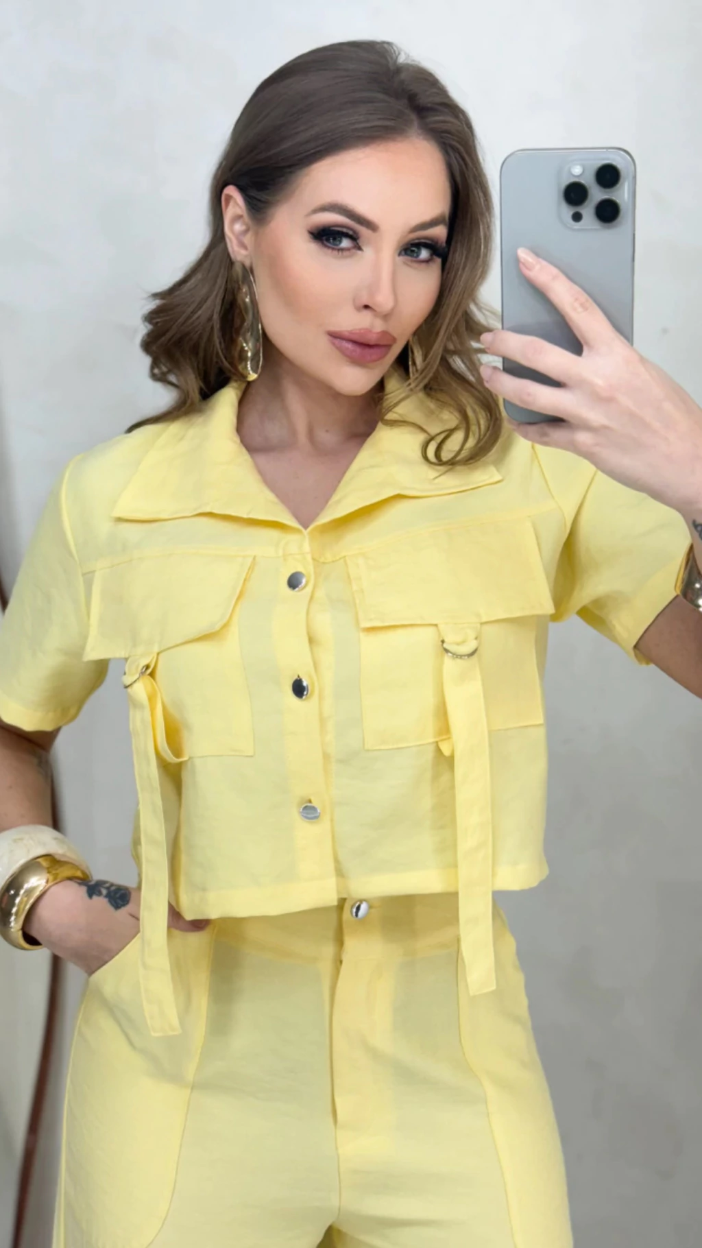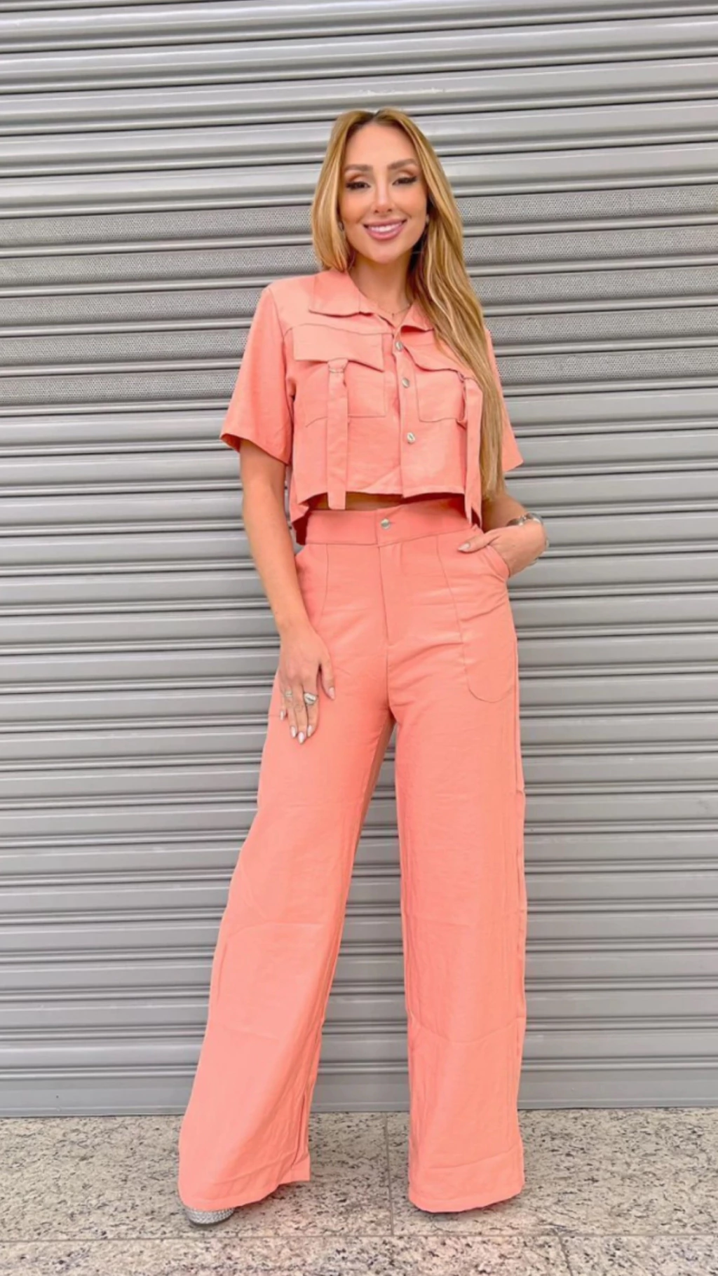 A parte superior traz um cropped estruturado, com bolsos frontais utilitários, botões dourados e faixas decorativas, que elevam o design a um nível moderno e urbano. O corte é levemente soltinho, valorizando o corpo com leveza e um toque de poder.