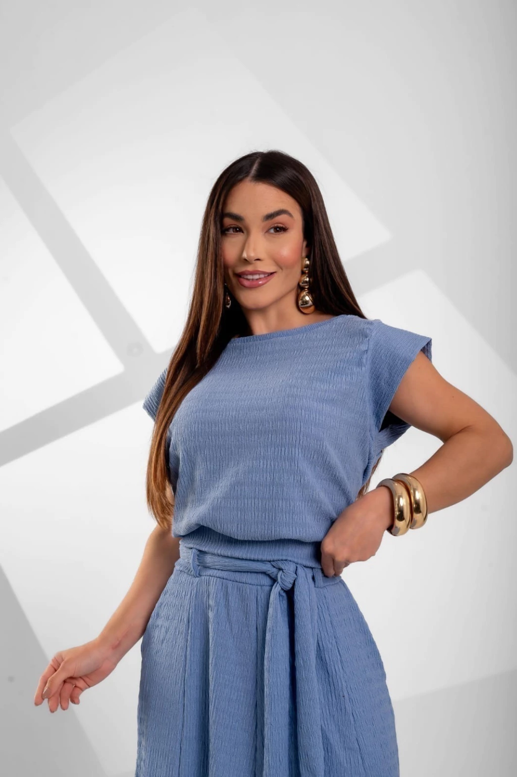 Conjunto feminino confeccionado em crepe ondule, tecido de textura delicada e toque encorpado que garante caimento leve e elegante. O semi cropped segue o estilo muscle tee, com ombros marcados e pala na cintura, proporcionando um visual moderno e estruturado. A saia midi possui modelagem fluida e acompanha faixa de amarração opcional, que pode ser usada para acinturar ou deixar o look mais casual.