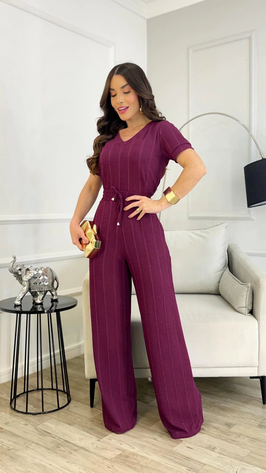 DETALHES: Blusa Gola V, que valoriza o colo feminino. Calça com bolsos funcionais, bem acinturada. Modelagem ampla e confortável.