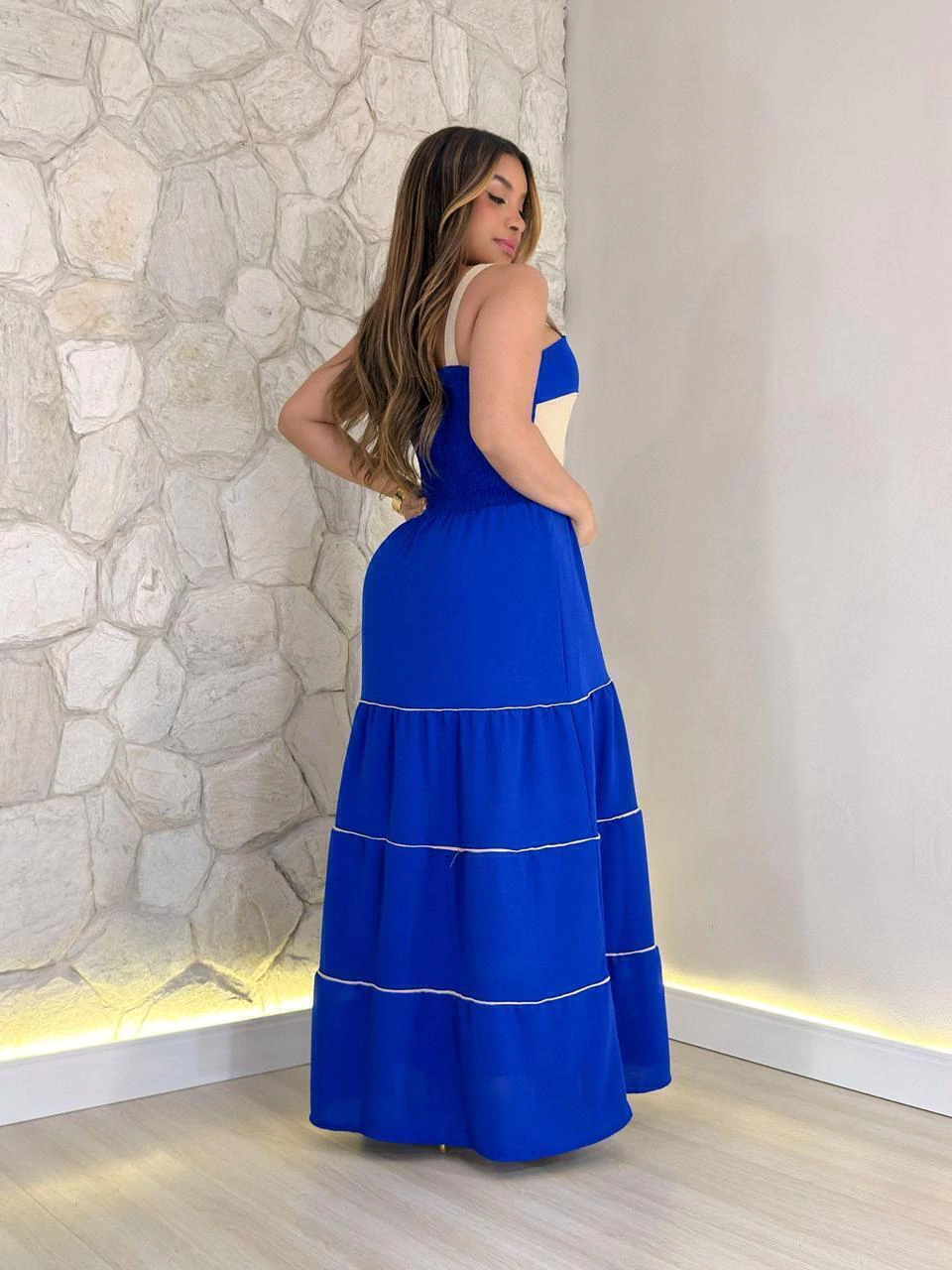 Modelagem: longa e fluida, com saia em camadas que garantem movimento e leveza