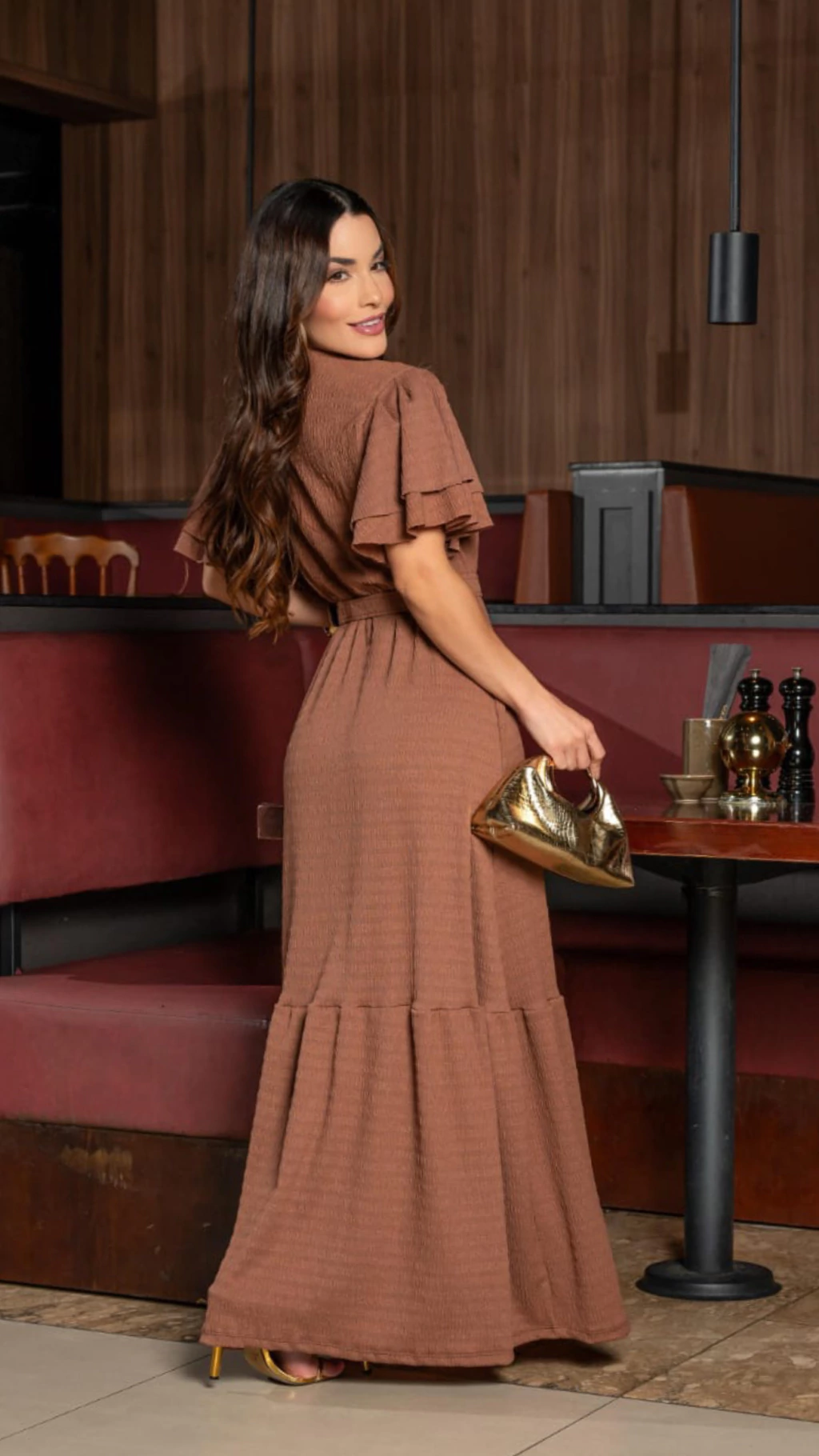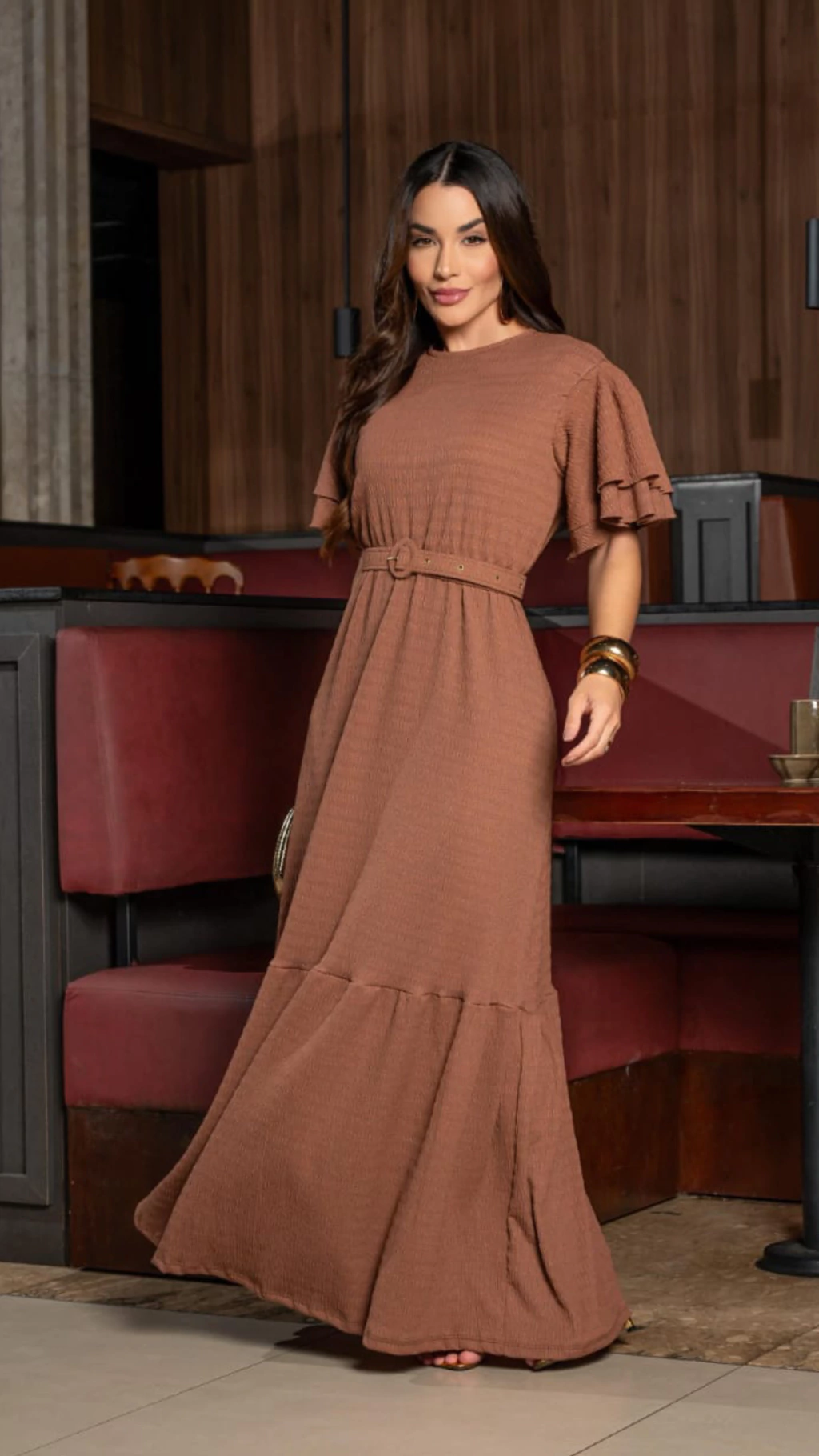A parte superior apresenta mangas duplas em camadas, criando um efeito delicado e elegante, além de trazer volume na medida certa. A cintura é marcada por um cinto encapado no mesmo tecido, que define o corpo de forma sutil e harmoniosa. A saia longa possui recorte com babado amplo, garantindo fluidez, balanço e um visual sofisticado que não passa despercebido.
