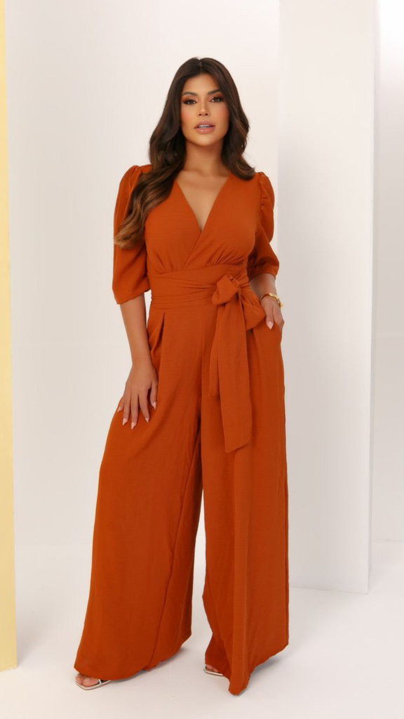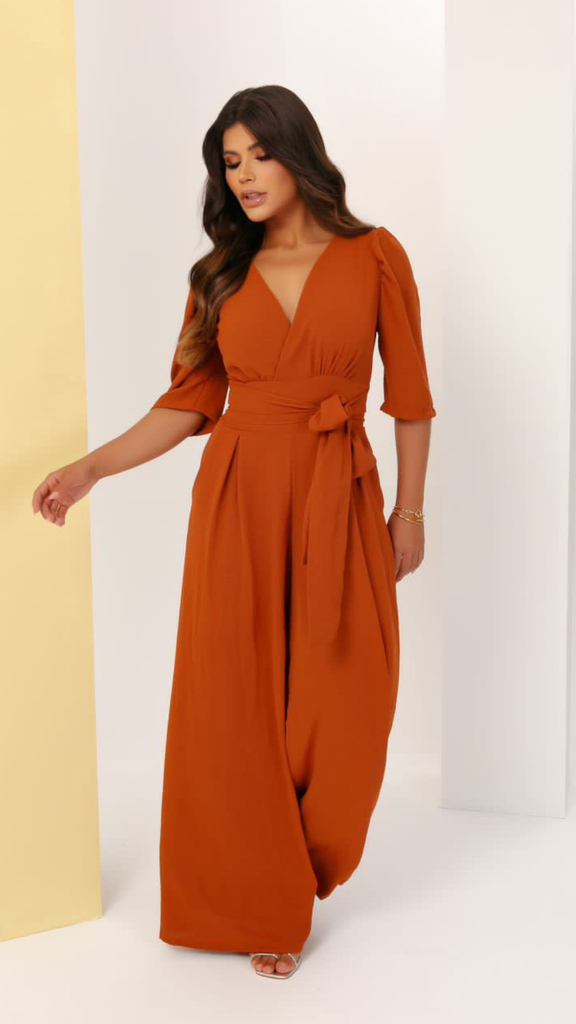 Um macacão super elegante com calça pantalona e decote em V, ambos detalhes trás um alongamento da silhueta, possui faixa de ajuste podendo usar de várias formas e com fechamento em zíper nas costas.