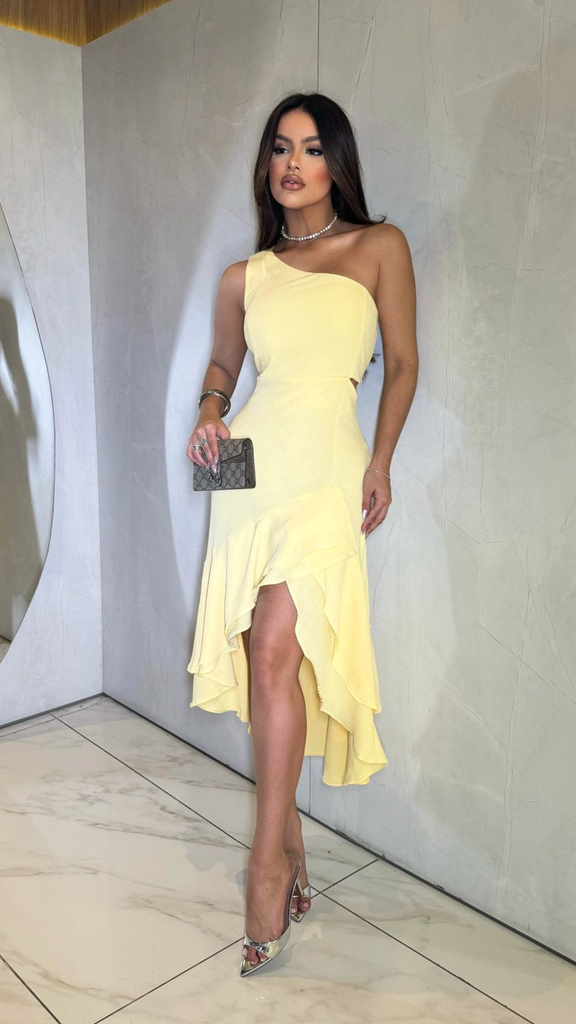 Possui decote de um ombro só, trazendo charme e ousadia na medida certa. A saia midi em camadas assimétricas com babado proporciona movimento fluido e sofisticado, enquanto o recorte lateral discreto adiciona sensualidade com elegância. O fechamento em zíper posterior garante praticidade e acabamento de alto padrão.