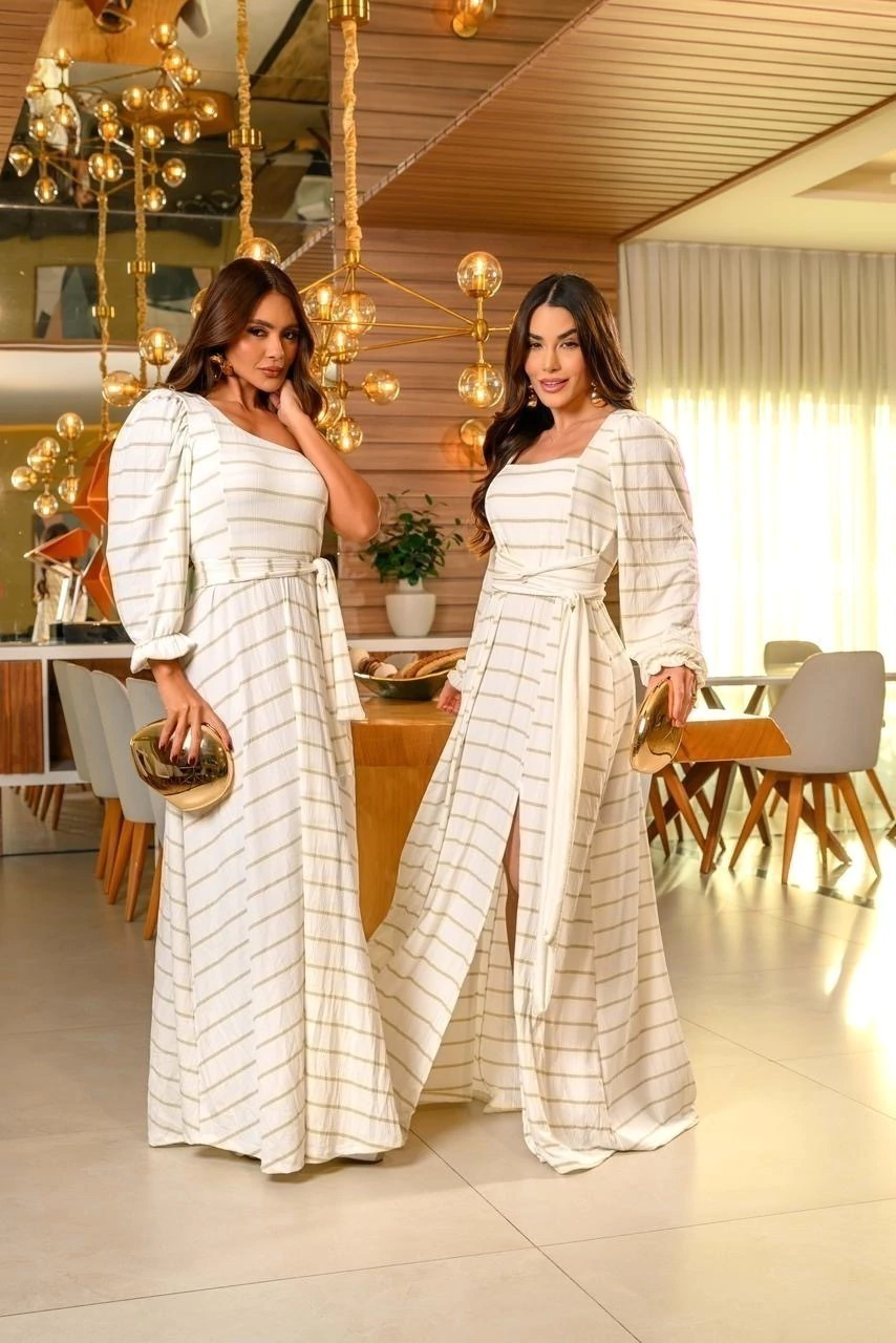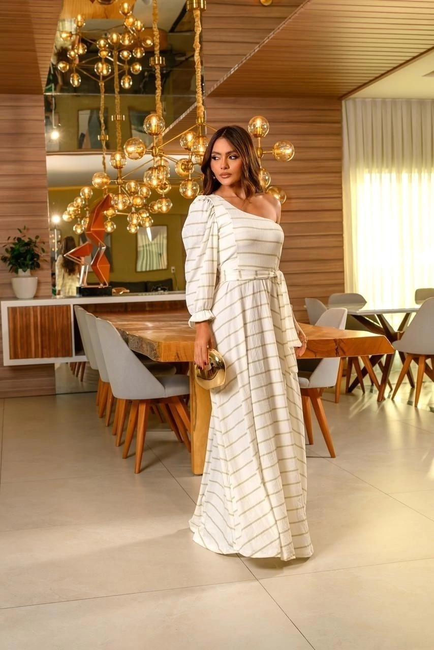 Este vestido longo é confeccionado em crepe Ohara com elastano, tecido de toque leve, elegante e com caimento impecável. Sua modelagem apresenta decote manga unica que valoriza o colo, mangas longas bufantes com punhos delicadamente franzidos e amarração na cintura, que define a silhueta com muito charme e feminilidade.