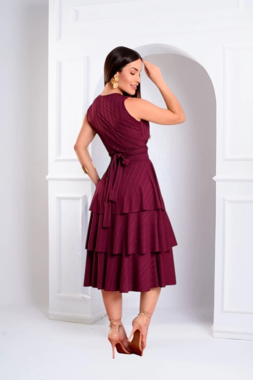 Acompanha faixa do mesmo tecido para amarração na cintura, valorizando a silhueta. Ideal para ocasiões especiais ou produções casuais refinadas.
