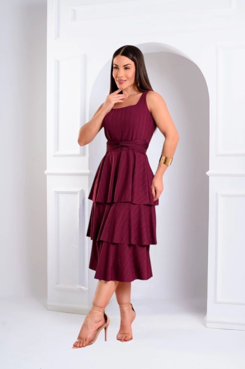 O modelo possui decote reto, alças largas e saia em camadas, criando um visual romântico e sofisticado.