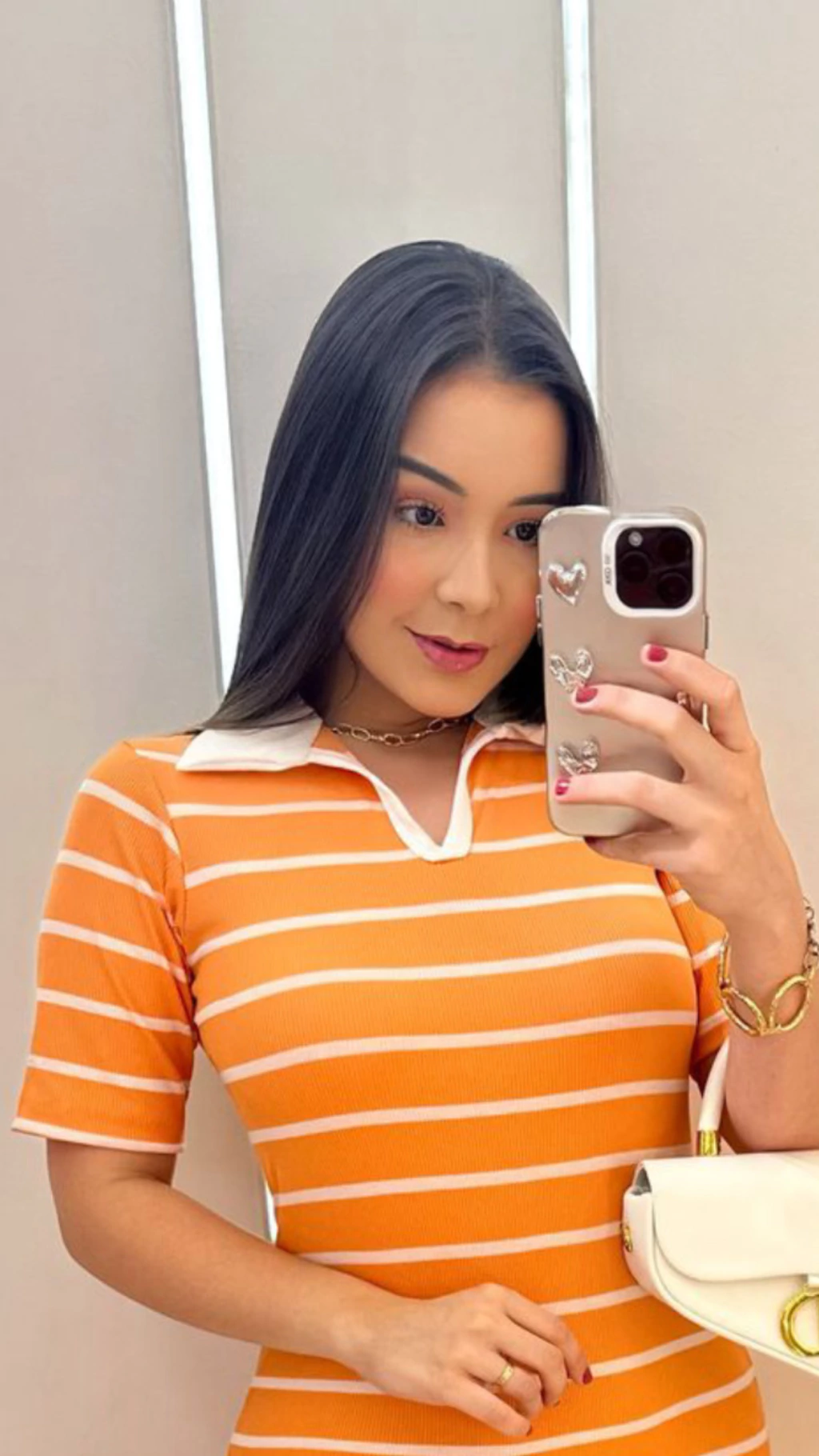 Esse vestido é a definição de charme com conforto! Confeccionado no canelado Concórdia premium, o modelo traz uma textura encorpada e maleável, que se ajusta ao corpo com elegância. Possui comprimento midi, mangas curtas e gola polo branca com abertura em “V”, garantindo um toque esportivo e moderno. A estampa listrada em tom laranja claro com branco é leve, feminina e super versátil — perfeita para looks do dia a dia com estilo. Combine com tênis, rasteiras ou até uma sandália mais sofisticada para diferentes ocasiões.